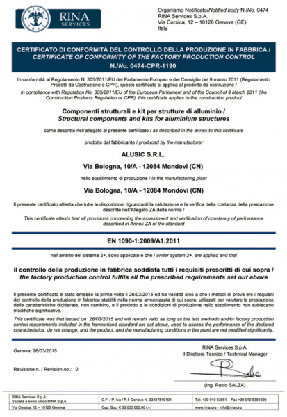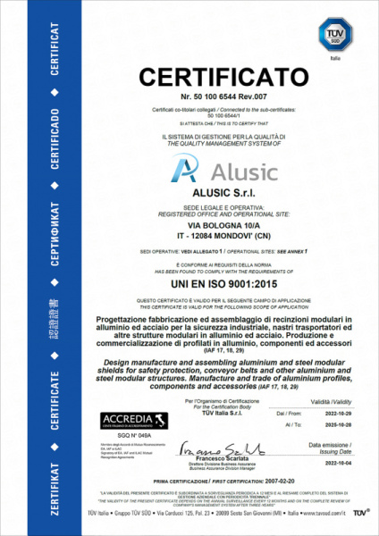 ISO 9001:2015 - Společnost Alusic získala certifikaci ISO 9001:2015 díky svému neustálému závazku kontrolovat svůj systém řízení a výroby a prokazovat kvalitu a efektivitu svých podnikových procesů.