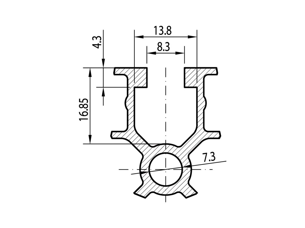 Zaoblené rohy profilu pro snížení rizika poranění. Vyrobený z hliníkové slitiny EN AW 6060 T5, anodizační vrstva více než 12 mikronů, tolerance podle normy EN 12020-2.