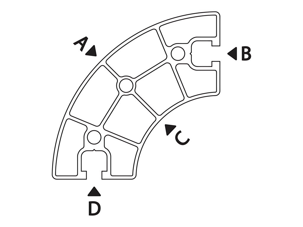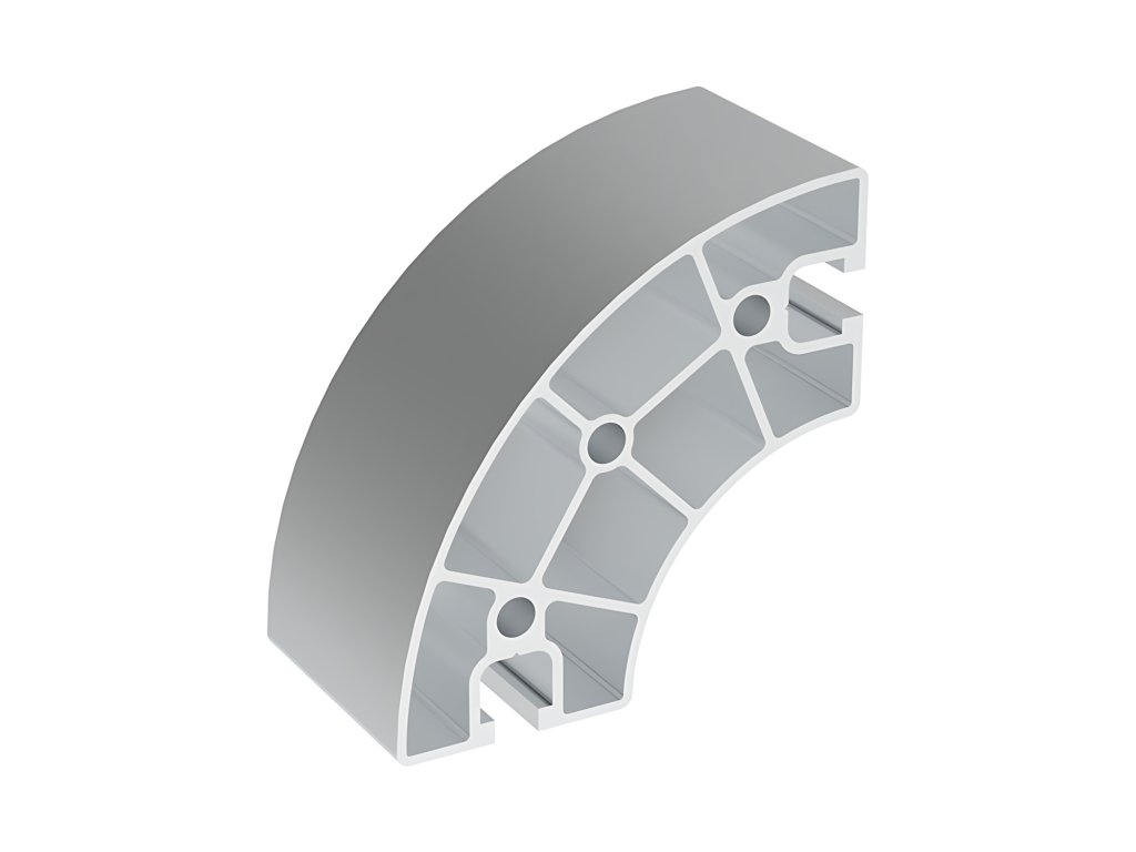 Speciální oblý hliníkový profil s modulovým řezem 90x90 určený pro vytváření oblých rohových příček.
