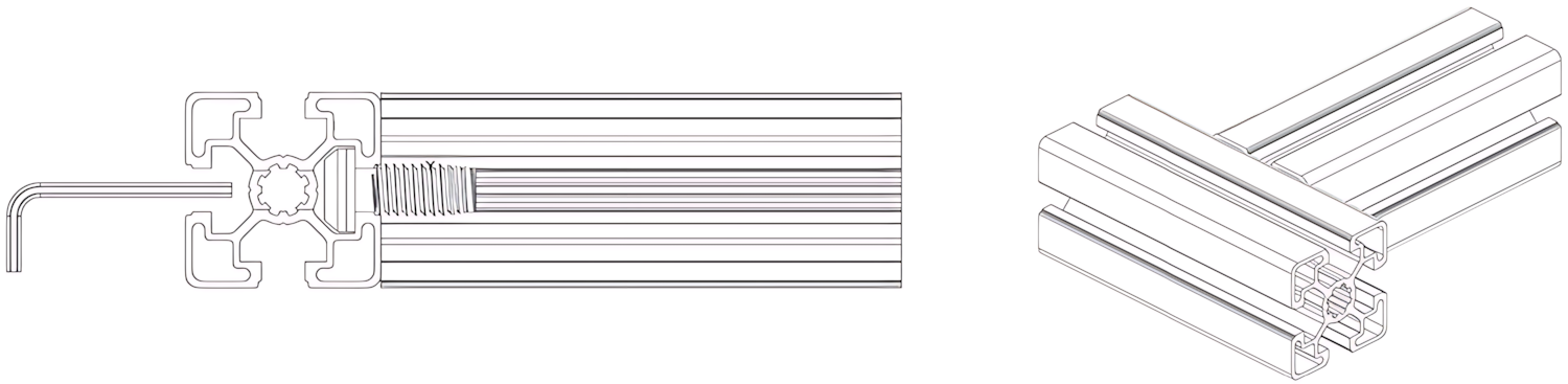 Dies ist die einfachste und schnellste Art der Montage. Dieses Verbindungssystem garantiert eine gute Rechtwinkligkeit zwischen zwei Oberflächen (abhängig vom Profilschnitt) und eine gute Beständigkeit der gegenseitigen Verbindung in Querrichtung zur Nut.