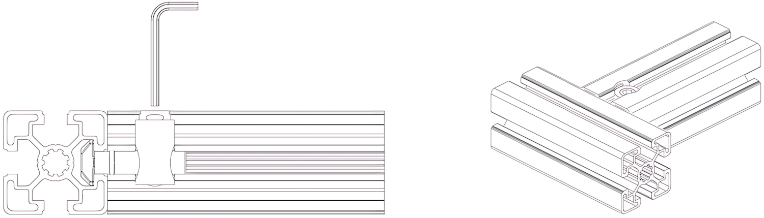 Jedná se o nejjednodušší a nejrychlejší způsob montáže. Tento systém spojení garantuje dobrou kolmost mezi dvěma povrchy (v závislosti na řezu profilů) a dobrou odolnost vzájemného spojení v příčném směru k drážce.