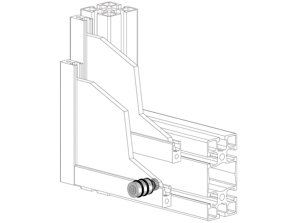 Čep je spojen s dvířky šroubem M8x30 pomocí otvoru v profilu o průměru D=8 mm a z druhé strany do drážky AC 45-8.