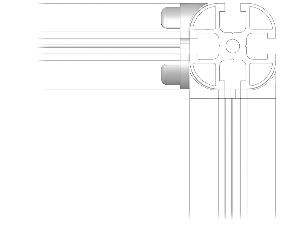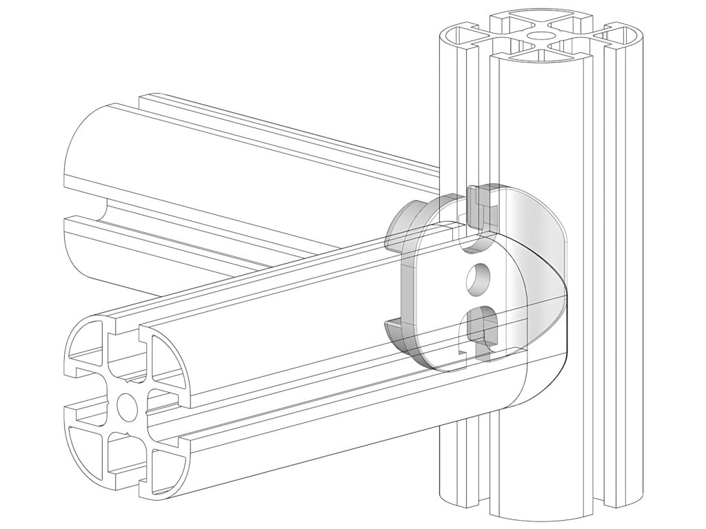Spojka pro vytváření kolmých spojů kulatých profilů série AC 45-8 s řezem 45x45 ve 3 osách.