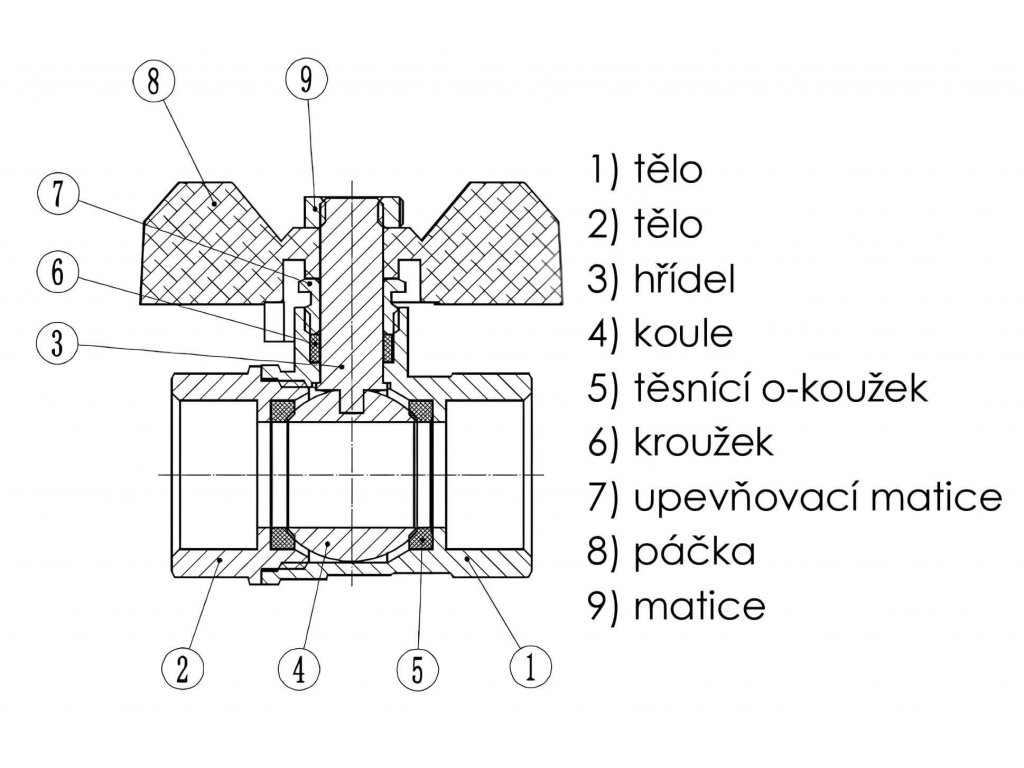 - Tělo, závitová část a koule z mosazi MS58, ovládací páčka v červené barvě