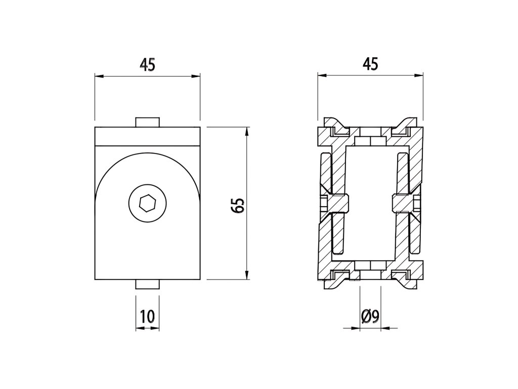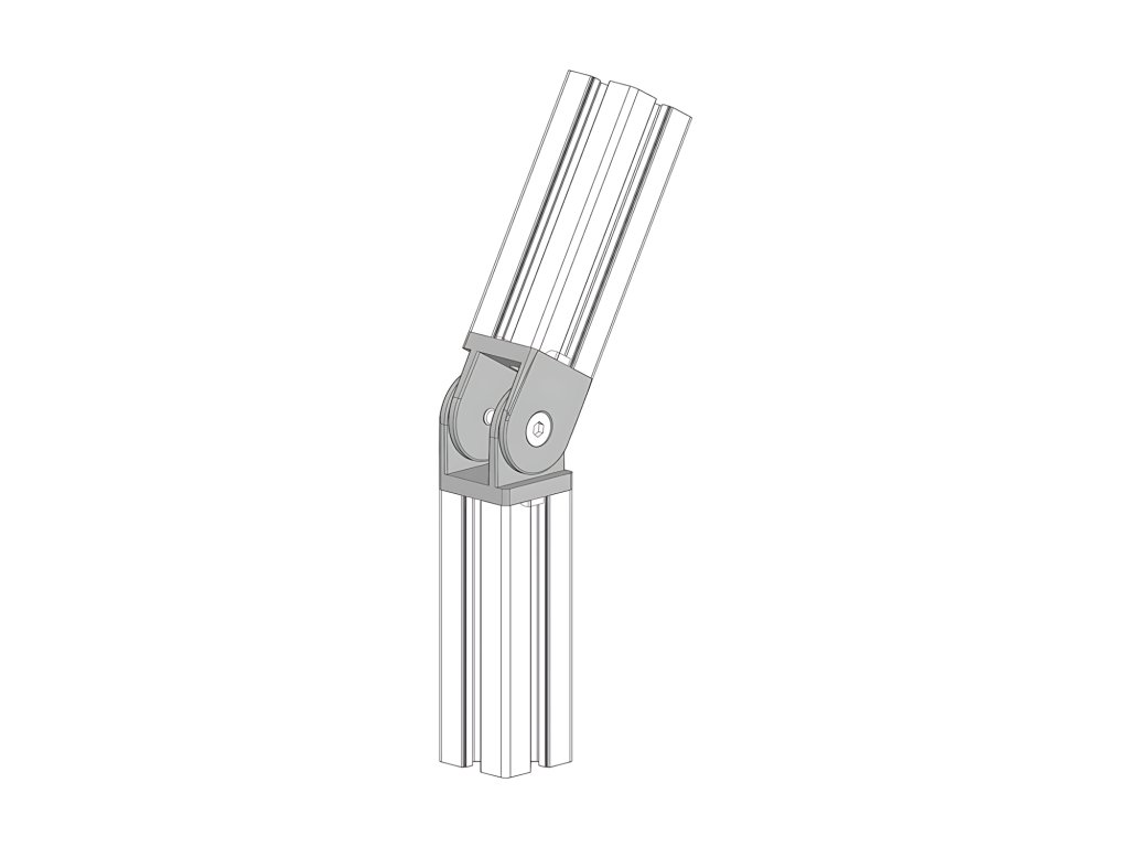 Spojka pro vytvoření kyvného spoje mezi profily série BH 45-10 s řezem 45x45 s možností aretace pomocí dotažení imbusového šroubu.