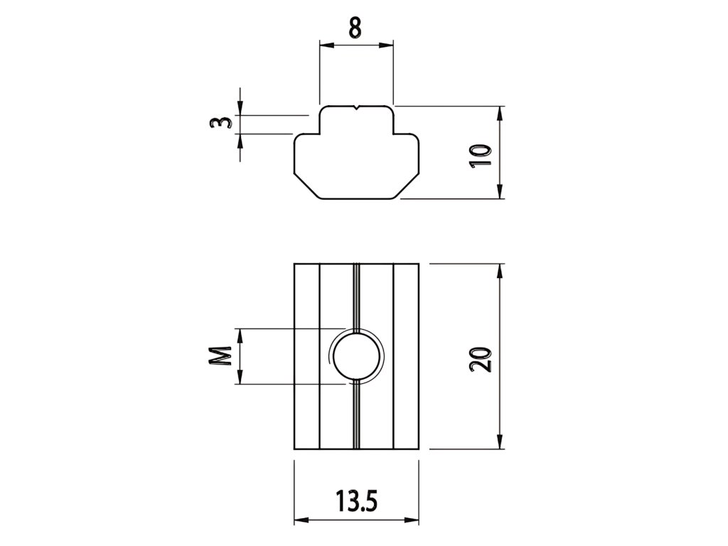 Obdélníková matice se závitem M8 pro montáž do drážky profilů sérií AC 40-8 a AC 45-8.