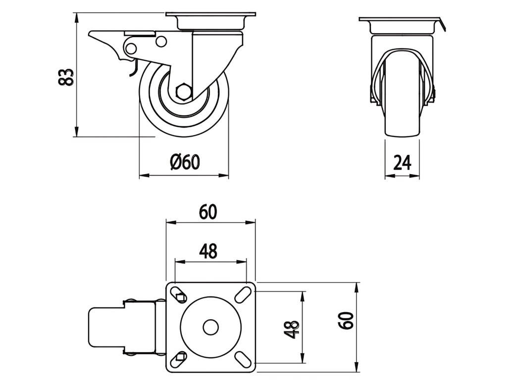 Otočné kolečko s průměrem 60mm pro montáž pomocí příruby 60x60.