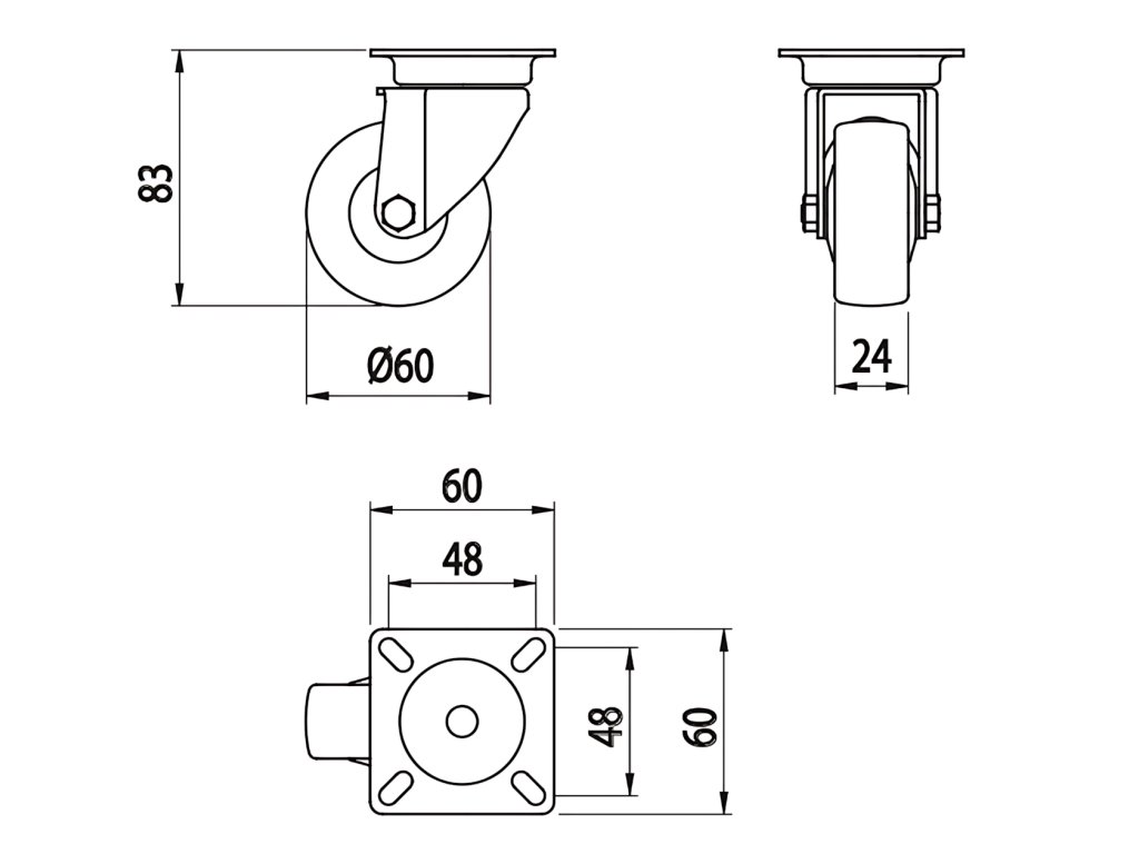 Otočné kolečko s průměrem 60mm pro montáž pomocí příruby 60x60.