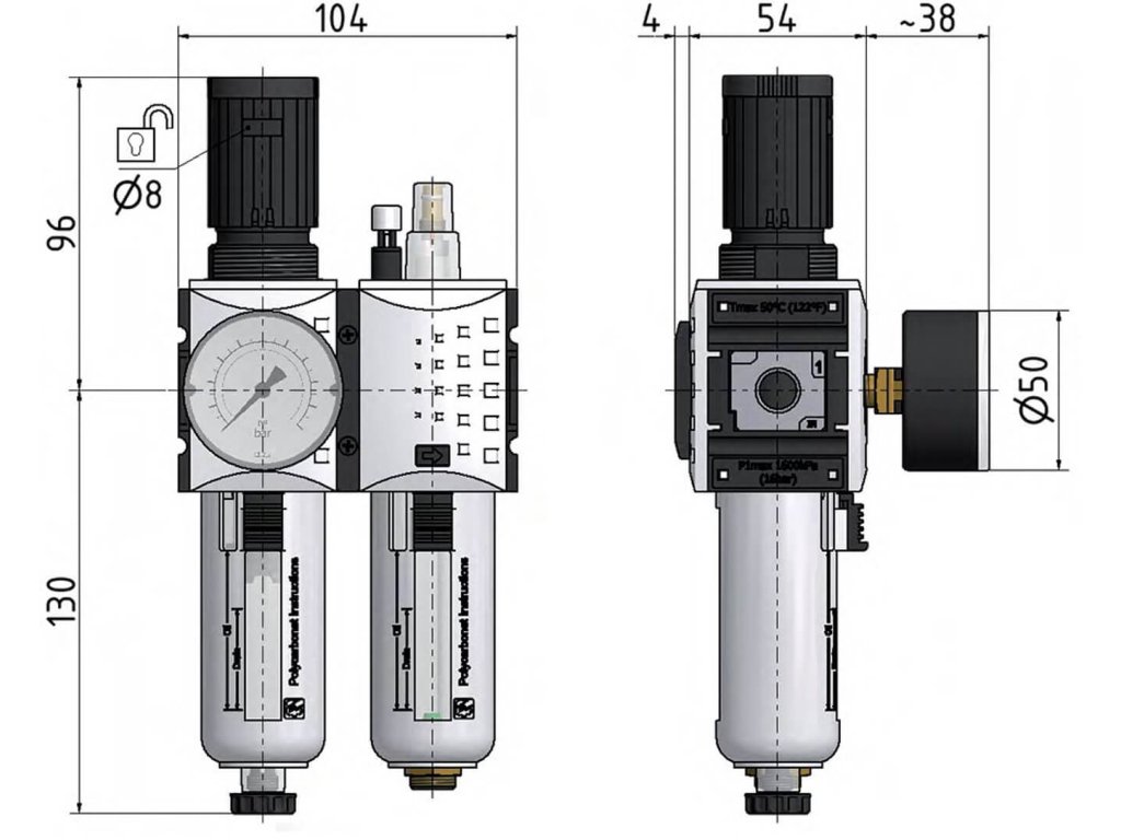 - Zespół regulatora ciśnienia z filtrem i odolejaczem w jednym urządzeniu
