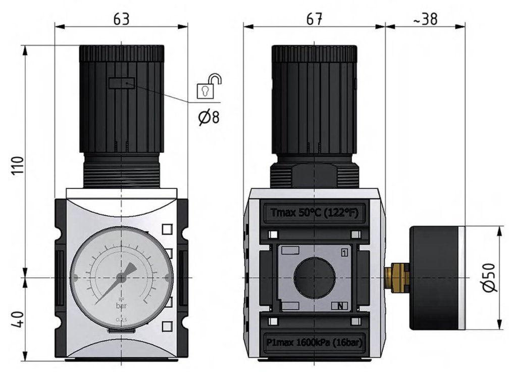 - Maksymalne ciśnienie wlotowe 16 bar, temperatura robocza -10°C do +50°C