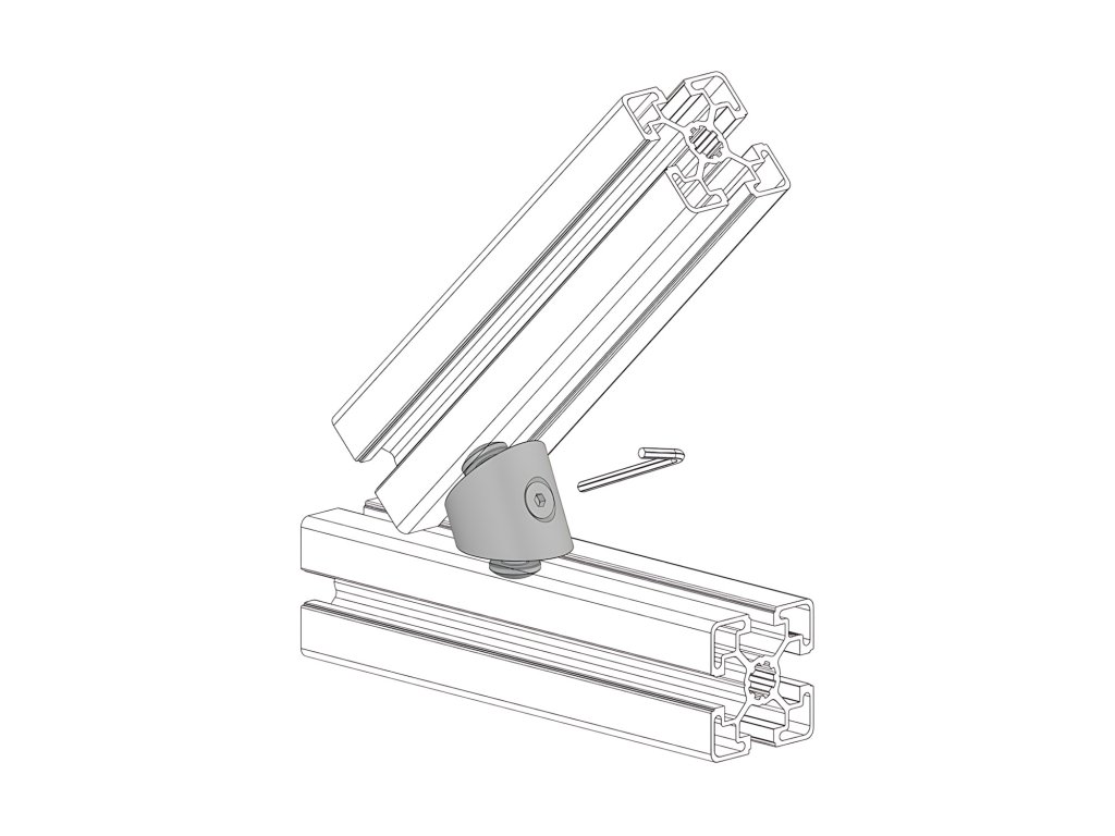 Kątownik do łączenia profili z rowkami serii BH 40-10, BH 45-10 i pod kątem 45° z możliwością dowolnej regulacji.
