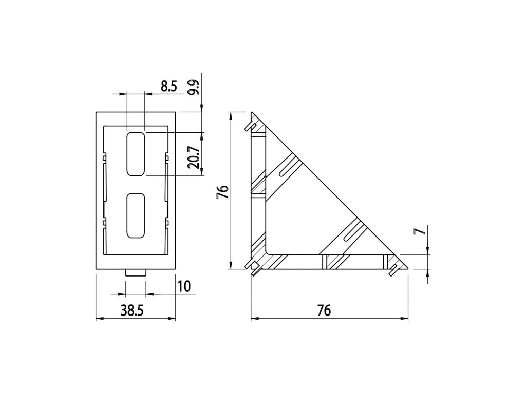 Uniwersalny kątownik o kącie 90° i wymiarach 38,5x76 do łączenia profili z zewnątrz za pomocą śrub M8x16.