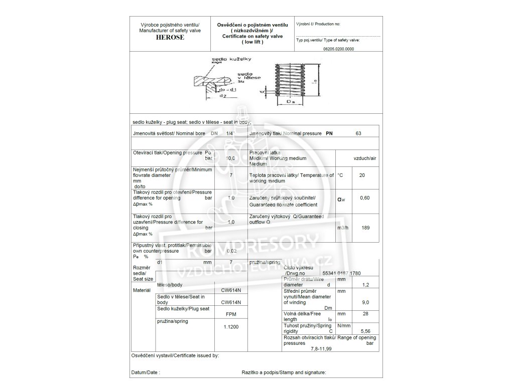 | Upozornění : Pojistné ventily dodáváme pouze nastavené na požadovaný tlak po 0,1 bar - uvádějte při objednání | |||||||