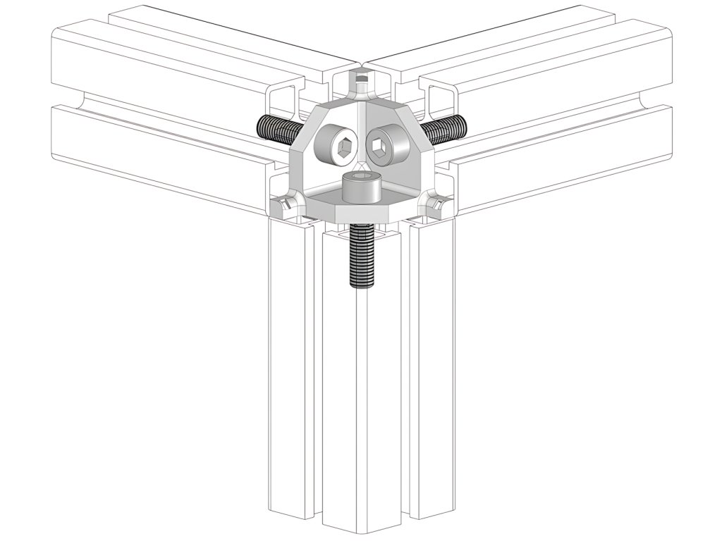 Rohová spojka pro spojení 3 profilů sérií AC 30-6 nebo BH 30-8 s řezem 30x30 pod úhlem 90°.