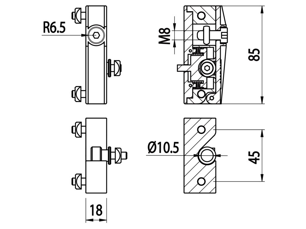Sada dílů pro rychlou a bezpečnou fixaci panelů pro oplocení vyrobené z profilů s drážkami série IM 40-8.