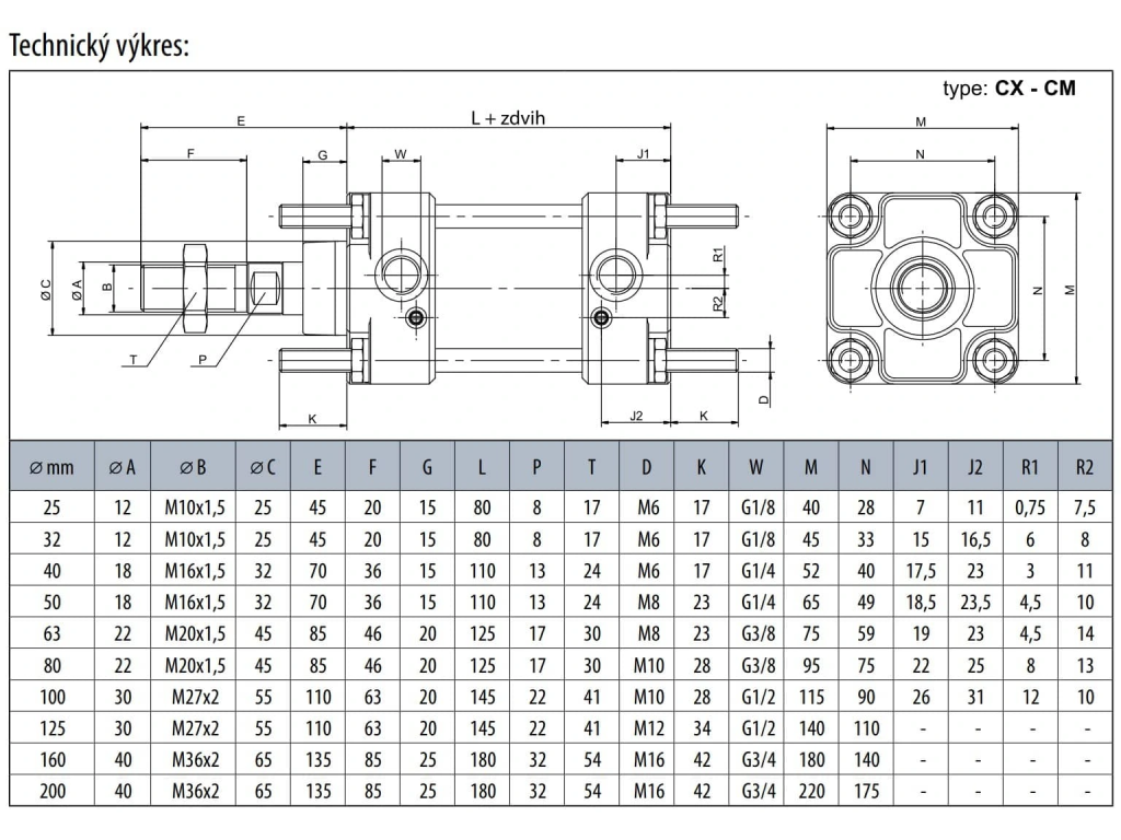 Dvojčinný valec CM s priemerom 40 mm s magnetom. V súlade s CNOMO 06.07.00. Vybavené nastaviteľným tlmením v koncových polohách. Viečka sú spojené strmeňovými tyčami. Vyrobené z hliníka a ocele C45.
