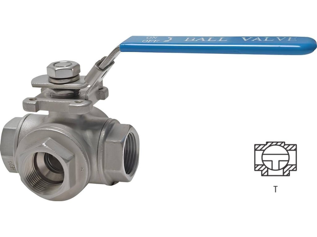 - Guľové kohúty z nehrdzavejúcej ocele s vnútorným závitom v trojcestnom vyhotovení, ovládané pákou