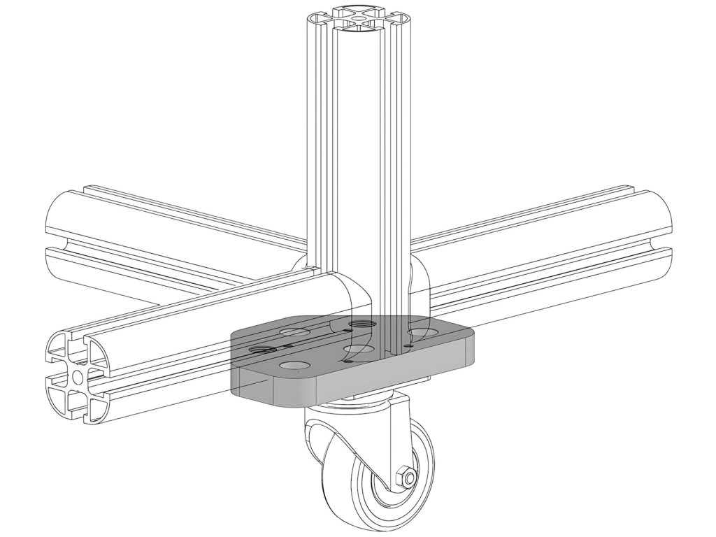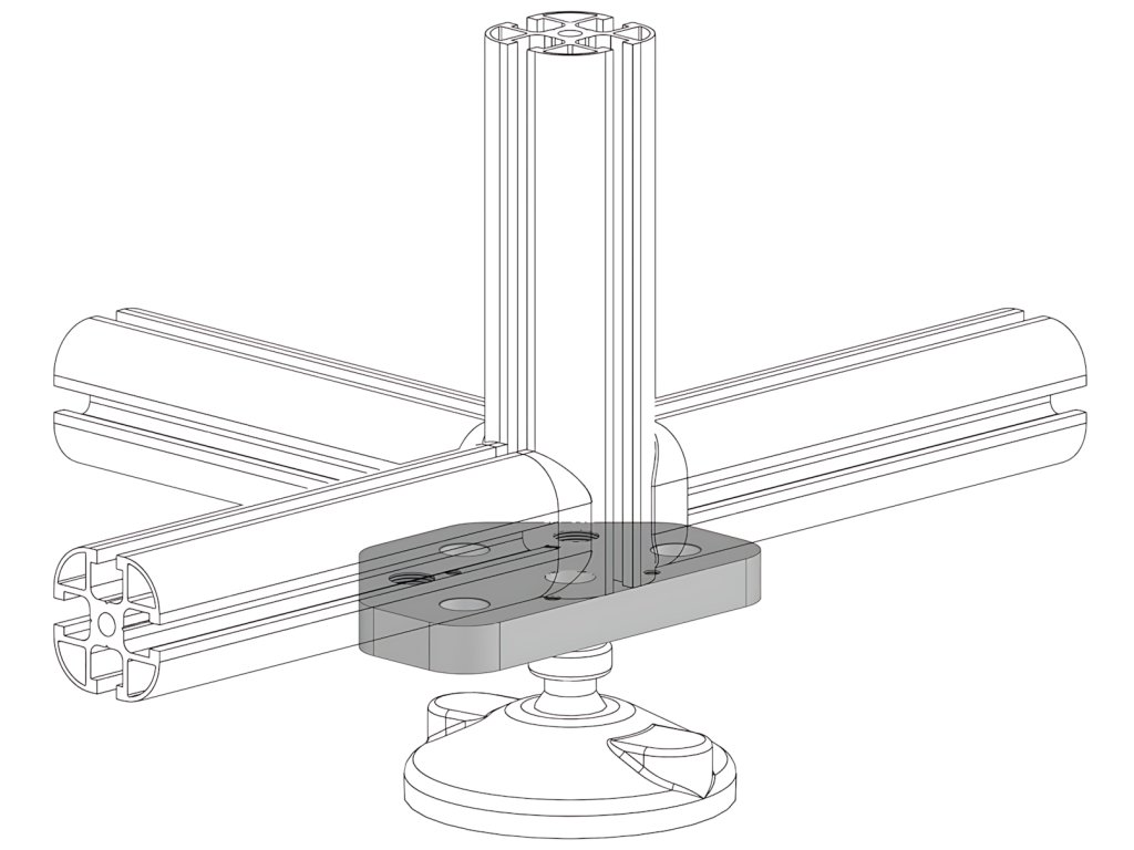 Středová příruba pro montáž podstavců se závitem M16 a koleček s přírubou 60x60, ke středovému spoji z kulatých profilů série AC 45-8, s řezem 45x45.