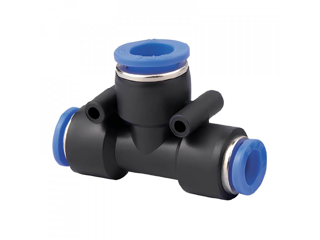 T-spojka v plastovém provedení pro montáž hadičky 10 mm s menším spodním výstupem 6 mm