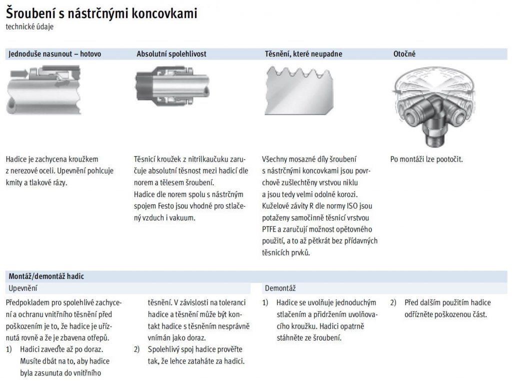- Nástrčné spojky se zmenšenými rozměry a hmotností, pro rychlou a jednoduchou montáž plastových hadiček