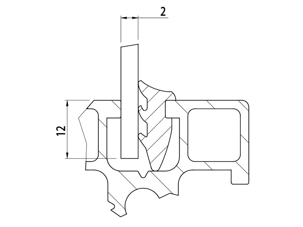 Těsnění do drážky profilu pro připevnění panelů s tloušťkou 2 mm do drážek se šířkou 8 mm.