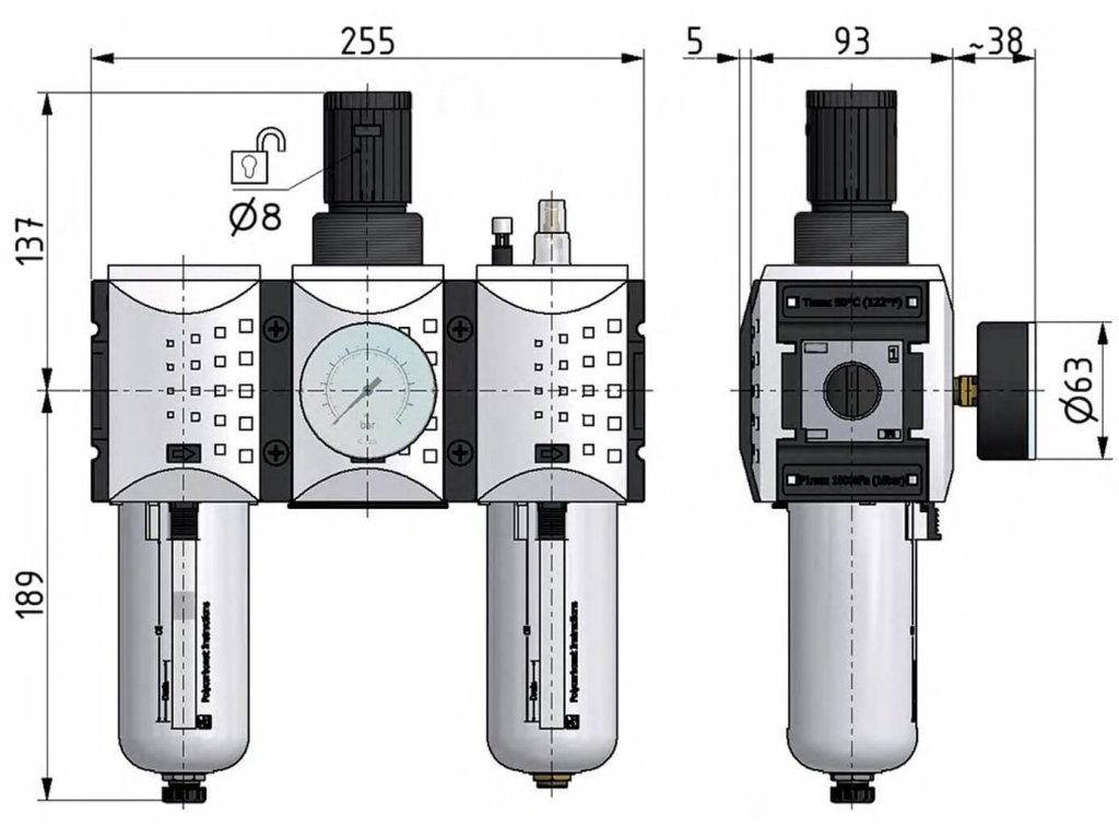 - Sestava regulátor tlaku s filtrem a olejovačem v jednom zařízení