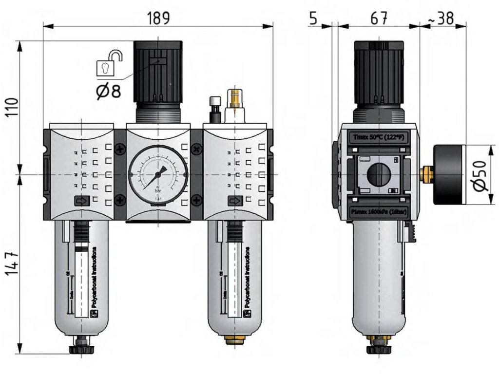 - Materiály : tělo Grivory (PA66), pružina POM, těsnění a membrána NBR, nádobka polykarbonát