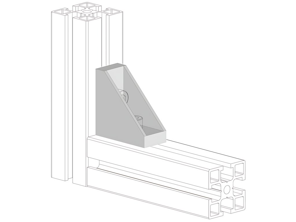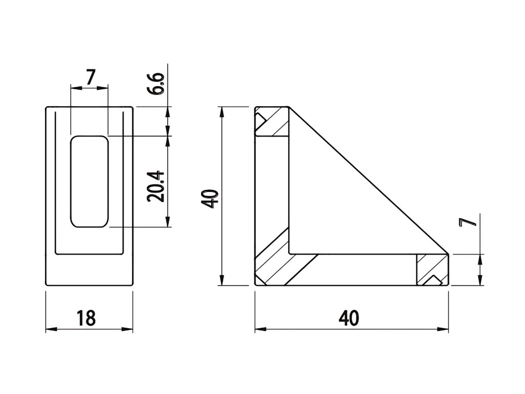 Univerzální úhelník s úhlem 90° a rozměry 18x40 pro spojování profilů z vnější strany pomocí šroubů M6.
