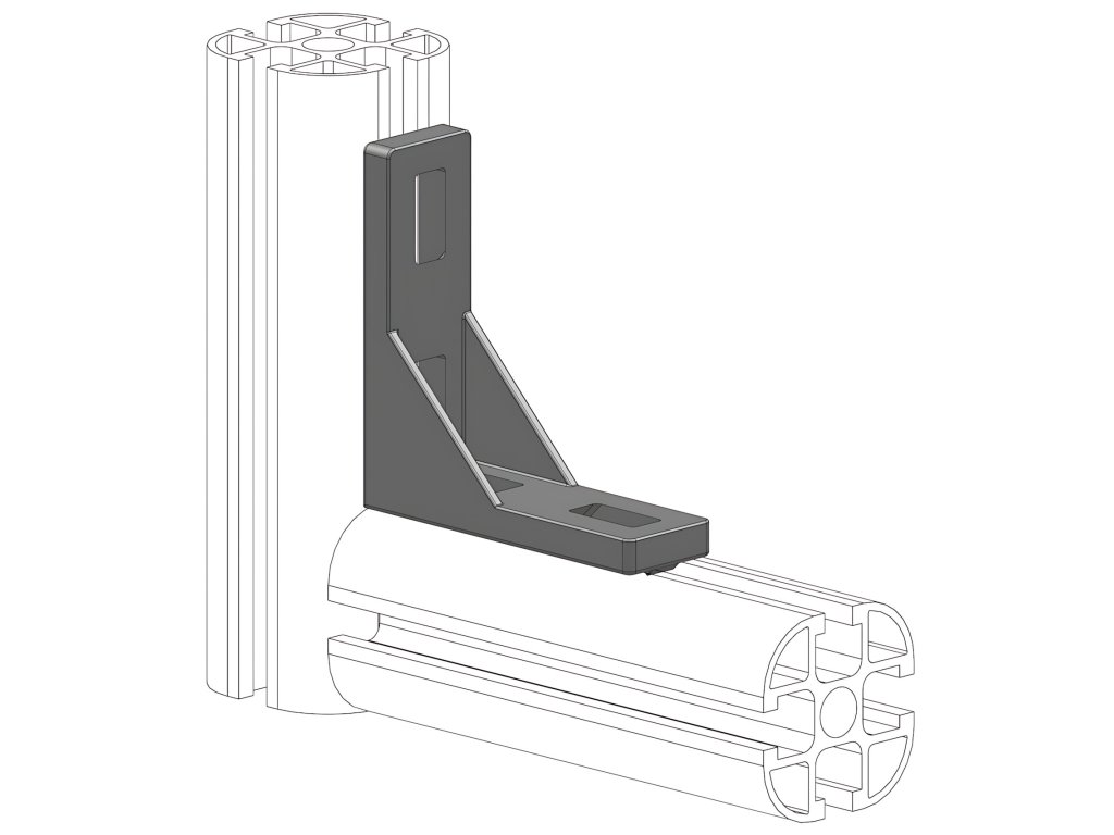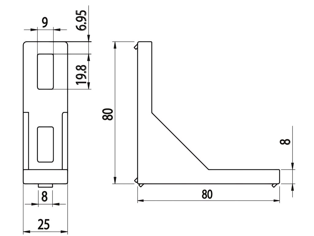 Univerzální úhelník s úhlem 90° a rozměry 25x80 pro spojování profilů z vnější strany pomocí šroubů M8x20.