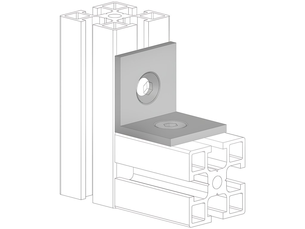 Malý úhelník s úhlem 90° a rozměry 30x30 pro spojování profilů z vnější strany pomocí šroubů se závitem M6 se zapuštěnou hlavou.