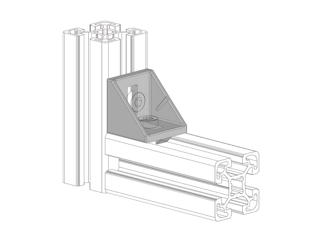 Univerzální úhelník s úhlem 90° a rozměry 38x36 pro spojování profilů z vnější strany pomocí šroubů M8x20.