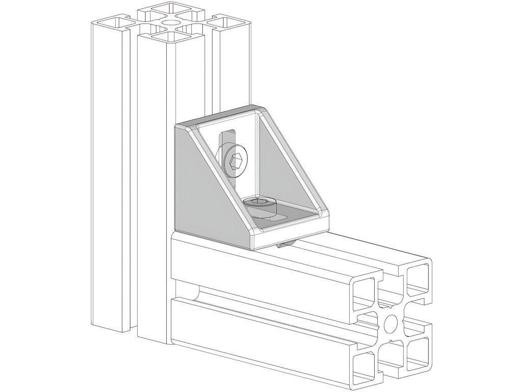 Univerzální úhelník s úhlem 90° a rozměry 43x43 pro spojování profilů z vnější strany pomocí šroubů M8x20.