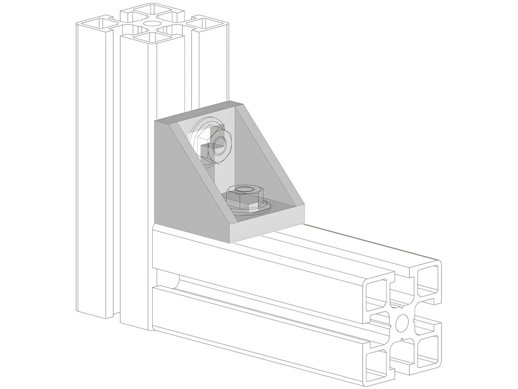 Univerzální úhelník s úhlem 90° a rozměry 43x43 pro spojování profilů z vnější strany pomocí šroubů M8x20.
