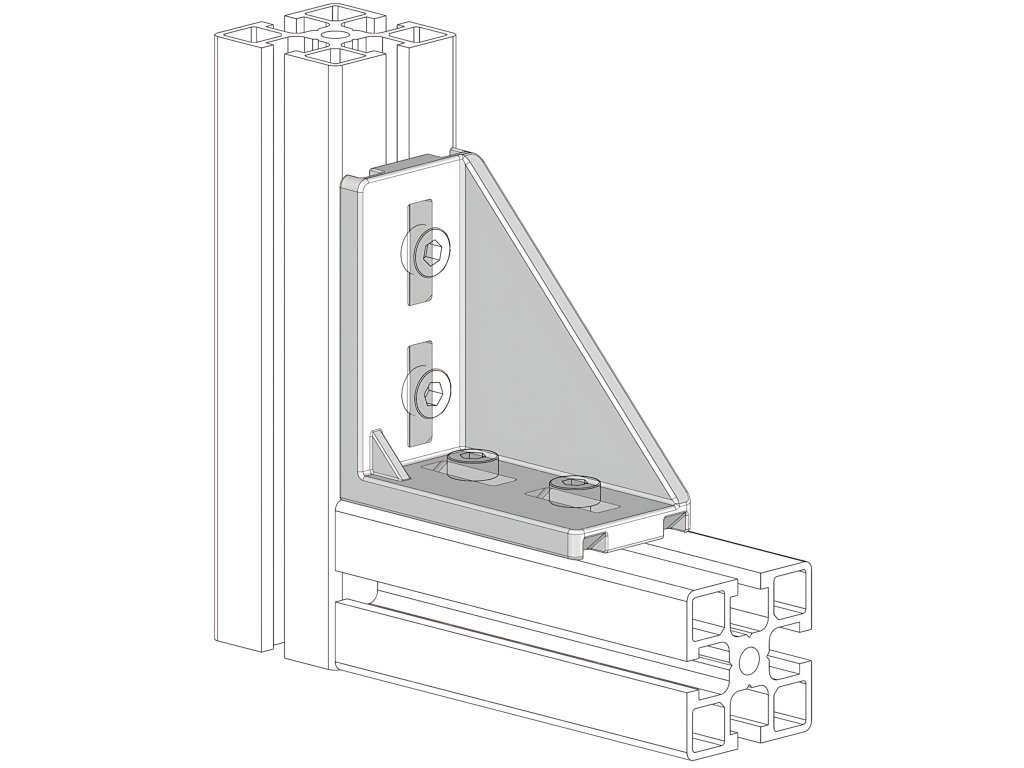 Univerzální úhelník s úhlem 90° a rozměry 43x86 pro spojování profilů z vnější strany pomocí šroubů M8x20.