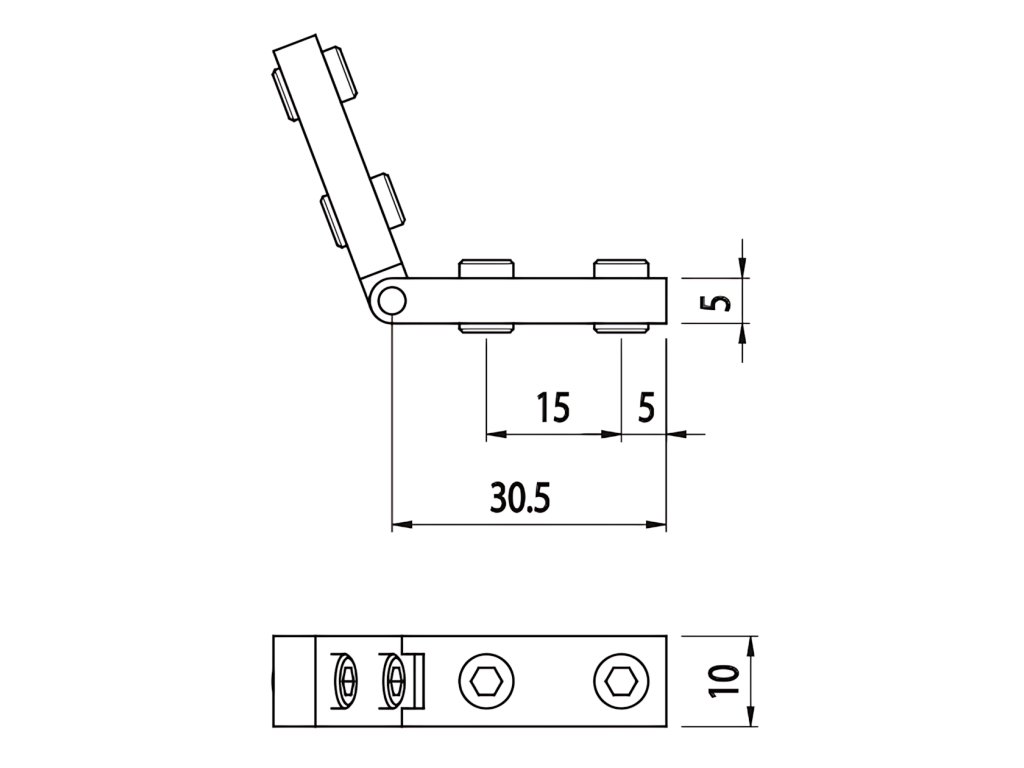 Kyvná spojka určená pro spojení profilů série AC 30-6 ve vertikálním směru pod libovolným úhlem.