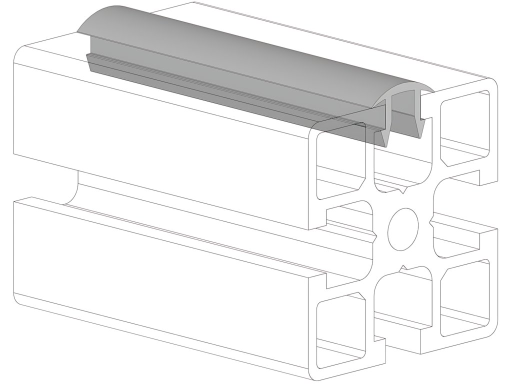 Záslepka z měkčeného PVC s oblým tvarem určená k uzavření drážky profilů sérií AC 45-8 a IM 40-8, v šedé barvě.